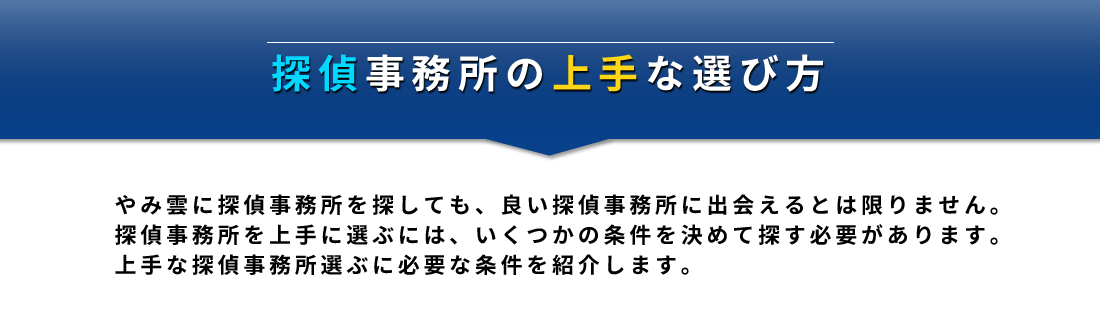やみ雲に探偵事務所を探しても、良い探偵事務所に出会えるとは限りません。探偵事務所を上手に選ぶには、いくつかの条件を決めて探す必要があります。上手な探偵事務所選ぶに必要な条件を紹介します。